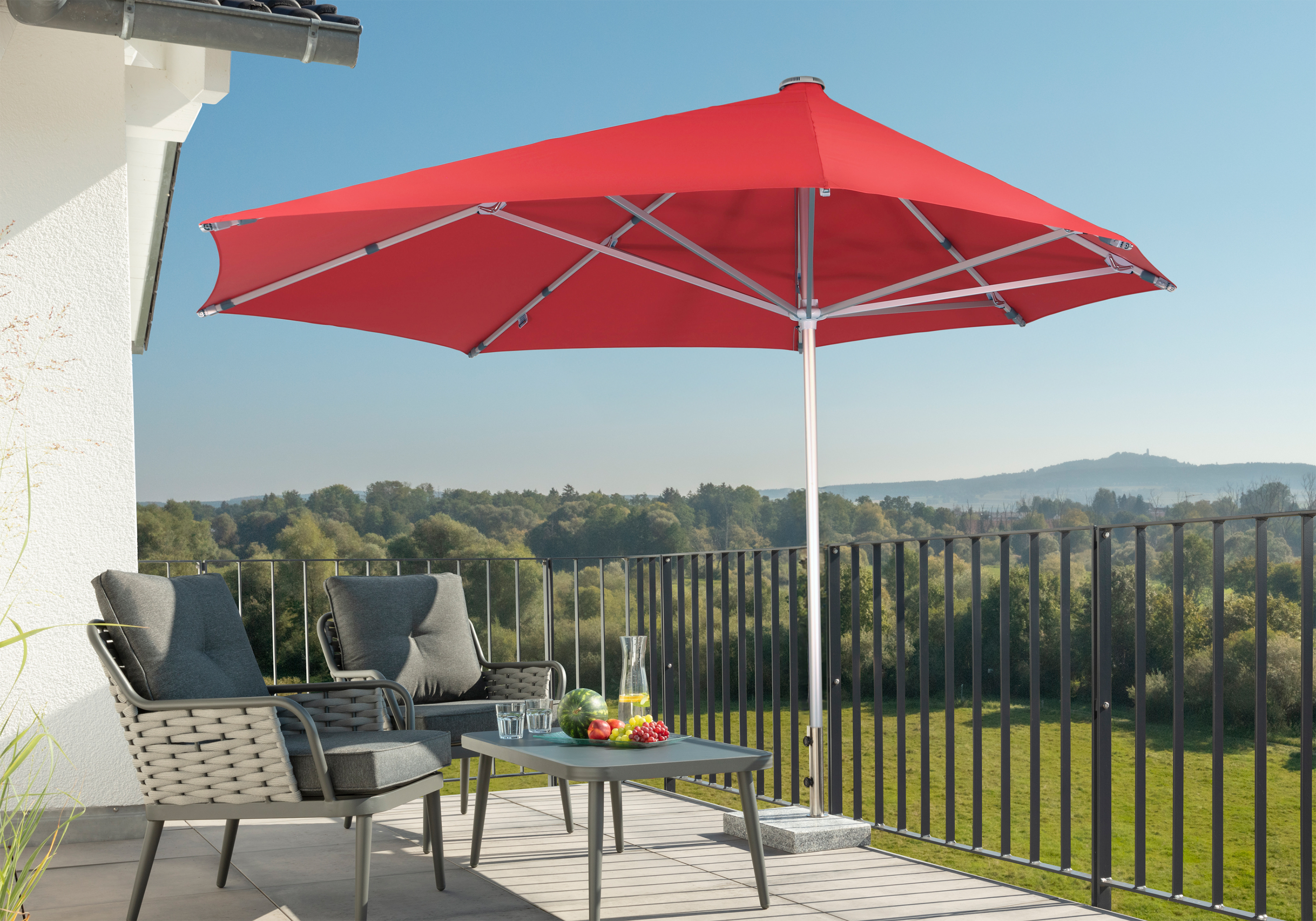 Unsere hochwertigen Sonnenschirme überzeugen mit robusten Glasfaser-Profilen, höchstem UV-Schutz und absoluter Wetterfestigkeit. Dank der patentierten Selbstöffnung lassen sich die Schirme in Sekunden öffnen und schließen.