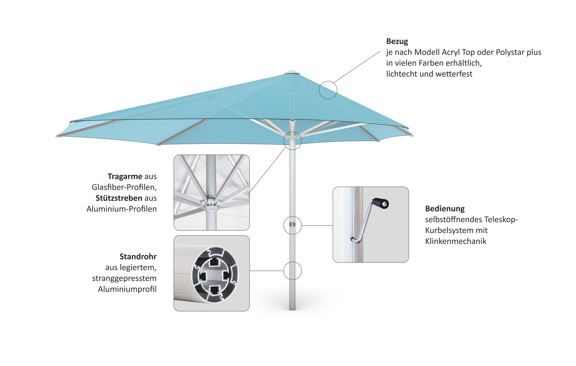 Die Glasfiber-Tragarme bieten eine stabile Unterstützung für das Schirmdach und sind nahezu unzerbrechlich.